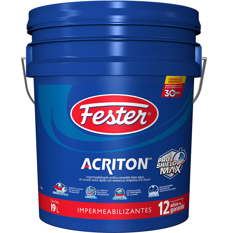 Fester 19 Litros Acriton 12 años Rojo es un impermeabilizante elastomérico fibratado de última generación que logra el mejor balance de propiedades mecánicas como son: la elongación, tensión y resistencia al desgaste; además de secado extra rápido, dando ventajas únicas en el mercado para poder hacer la impermeabilización completa en una mañana y ofrecer la mayor durabilidad.