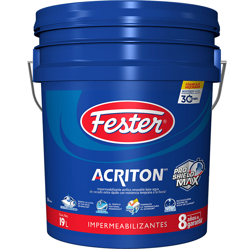 - Fester Acriton Proshield® en color blanco, se recomienda para impermeabilizar y lograr la máxima reflectividad con lo que se aísla la radiación solar, haciendo más confortables los interiores y logrando importantes ahorros en energía eléctrica ante el uso de sistemas de aire acondicionado o ventilación.
